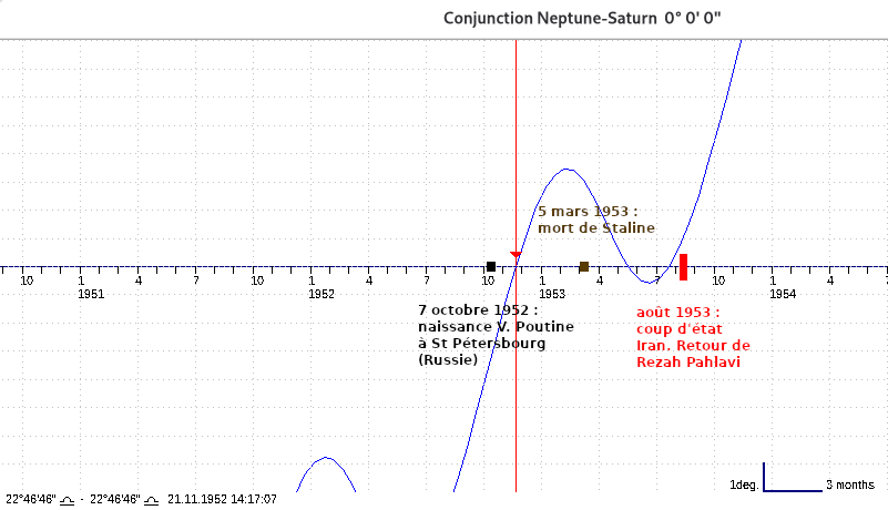 Je l'ai souvent écrit - en accord avec les travaux d'André Barbault - le cycle Saturne/Neptune rythme le destin de la Russie ; quant au cycle Saturne/Uranus, il s'agit des 'States'. En 1952, Saturne et Neptune sont déjà conjoints et au carré d'Uranus (écart de 90° entre deux planètes = aspect violent). Vlad est né sous ces "influences", dans un monde déjà en pleine "guerre froide". 1952 est en effet marqué par :