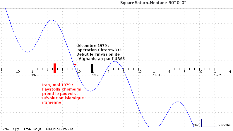 La révolution islamique iranienne interviendra avant que le cycle Saturne/Neptune se 'reboucle', lors du dernier carré ( = conflit) entre ces deux planètes, en mai 1979. Quelques mois après, en décembre 1979, l'URSS envahit l'Afghanistan, ce qui constitue un point d'orgue dans la guerre froide.
